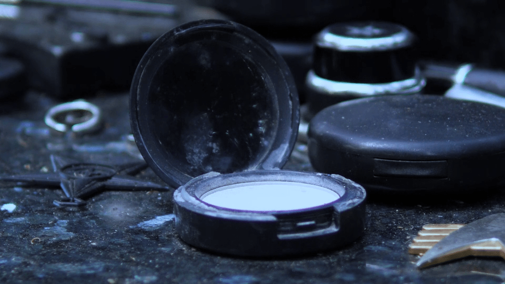 Jean-Luc Verna s’entretient à propos de son monument funéraire composé d’une pierre tombale supportant une coiffeuse en granit bleu et des effets personnels. Ce film dresse un portrait sans visage de l’artiste où chaque objet renvoie à l’autobiographie et à la mise en scène.